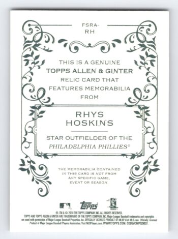 Rhys Hoskins RC Game-Used Jersey Mem Relic Allen & Ginter