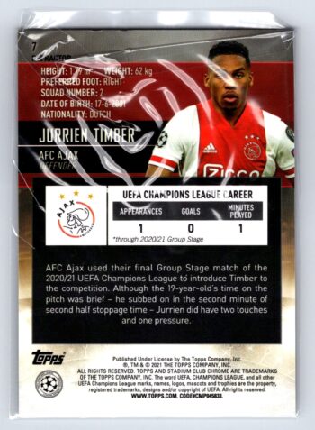 Jurrien Timber RC Rookie Refractor 2021 Stadium Club UEFA Champions League