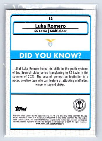 Luka Romero RC Rookie Aqua Prizm 2022 Merlin UEFA Europa League