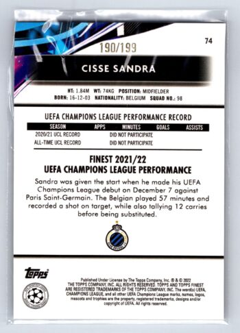 Cisse Sandra RC Rookie Raywave Refractor /199 2022 Topps Finest UEFA Champions League