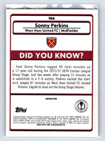 Sonny Perkins RC Rookie Refractor 2022 Merlin UEFA Champions League